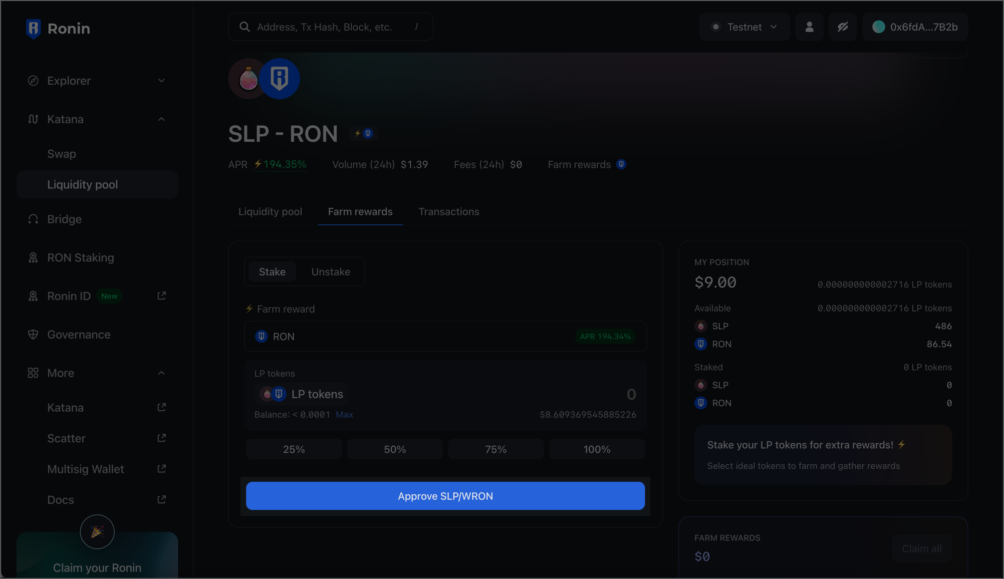 For example, to stake an SLP/WRON token pair, you need to approve it first. Click Approve SLP/WRON, then confirm the transaction in your Ronin Wallet.