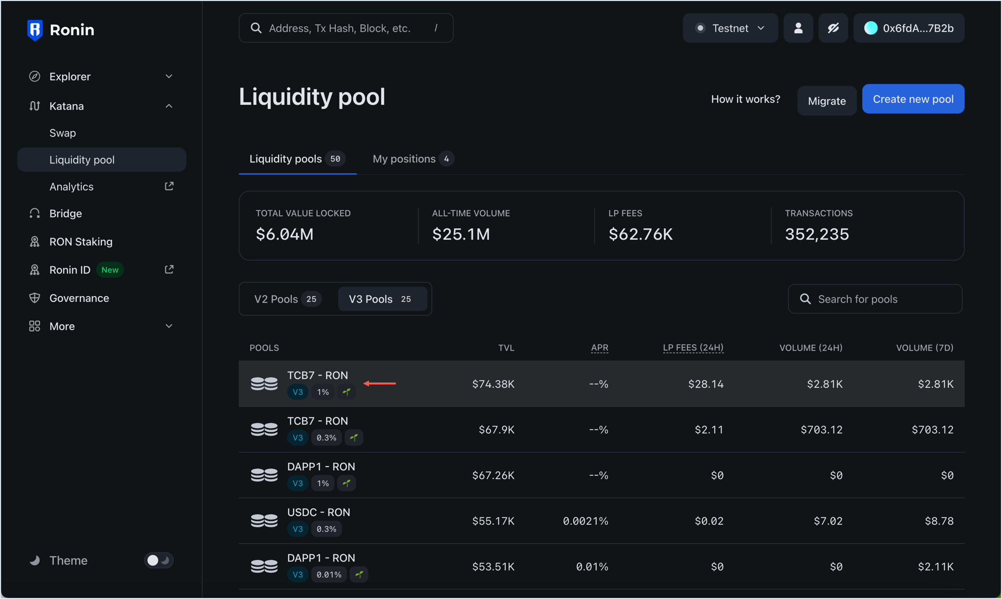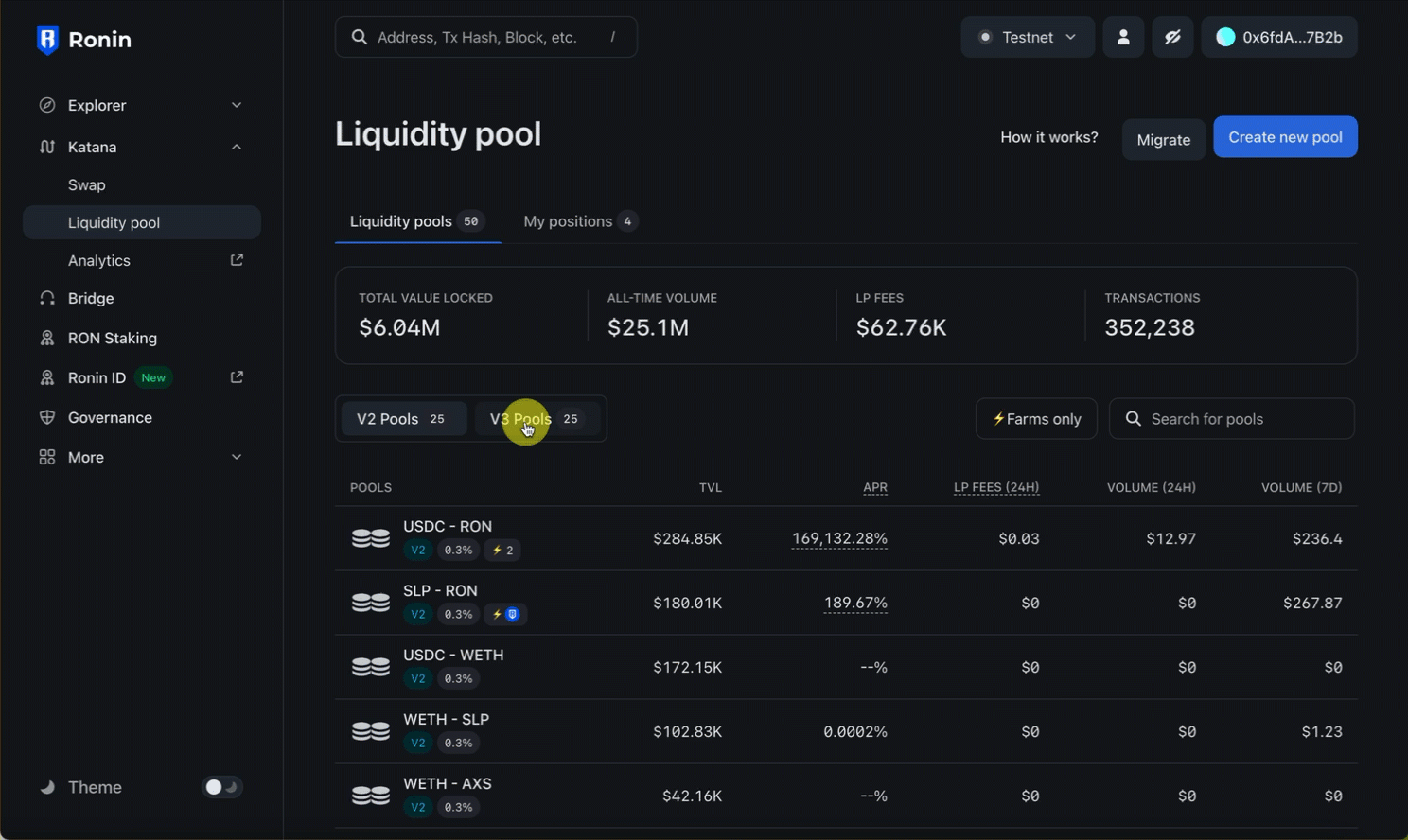 Katana V2 is a previous version of the Katana smart contract, which is still operational. Katana V3 is the latest version, which introduces concentrated liquidity, fee tiers, and improved oracles. When creating a liquidity pool, you can choose to use either Katana V2 or Katana V3.