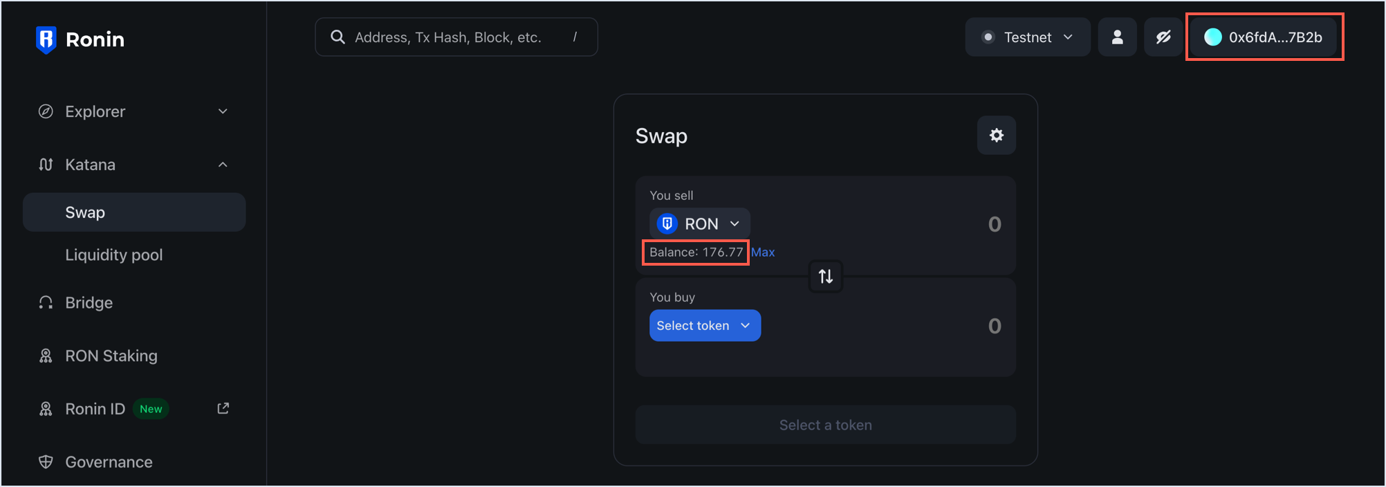 After connecting your Ronin Wallet to Katana, you can see the amount of RON you own and the wallet address you're connected to.